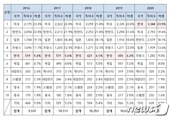 특허청에 따르면 미국이 2793건(19.6%)으로 2위, 핀란드가 2579건(18.1%)으로 3위, 일본이 1939건(13.6%)으로 4위, 프랑스가 1283건(9.0%)으로 5위에 올랐다.